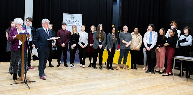 The winner was Tom Schofield (who was one of only four males in the competition) of Notre Dame Catholic Sixth Form College, Leeds. This was the second win in the six years of the competition for Notre Dame. Tom's topic was, "Assisted dying should be made legal". Second was Amelia Hopkinson from St Pius X Catholic high School, Wath-on-Dearne, Rotherham (particularly pleasing to the organisers as the school has entered every year and it is their first placement). Third was Maggie Naylor of Notre Dame Catholic High School, Sheffield.