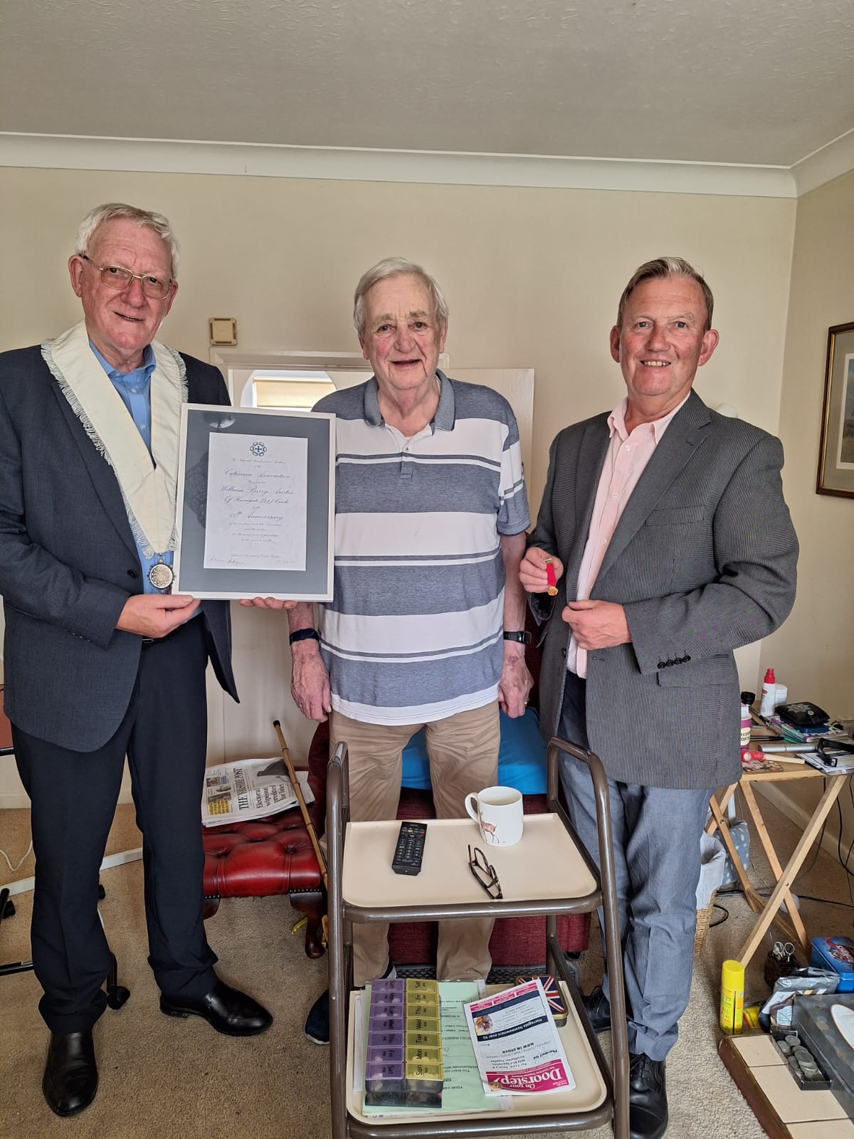 In July, four Harrogate Brothers celebrated their 40 year anniversaries and Province 3 Director and Harrogate Brother, John Tweddle, was on hand to present three of the Brothers with their anniversary scrolls, with a personal presentation to be made to Brother Barry Austin, who couldn’t attend on the evening. Brother President, Chris Bohills also presented a second Presidential bar to Brother Simon Gilbert following his third term as Harrogate President in 2020/22. In addition, John Tolan, John Tevlin and Simon Gilbert were presented with their 40-year miniatures.